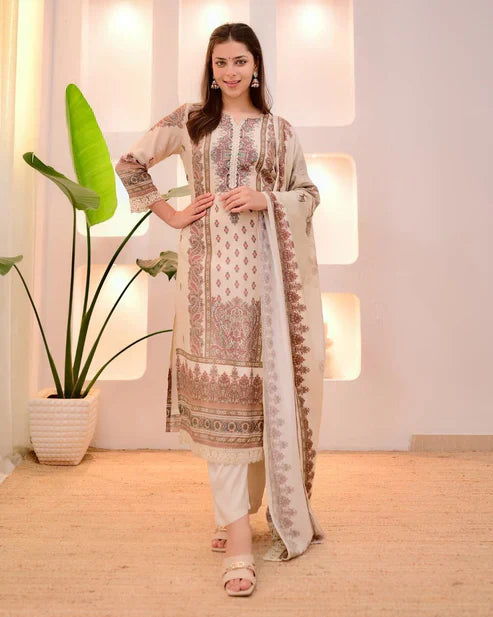 Luxury Pastel Cream Floral Printed Muslin Suit Set with Designer Dupatta
